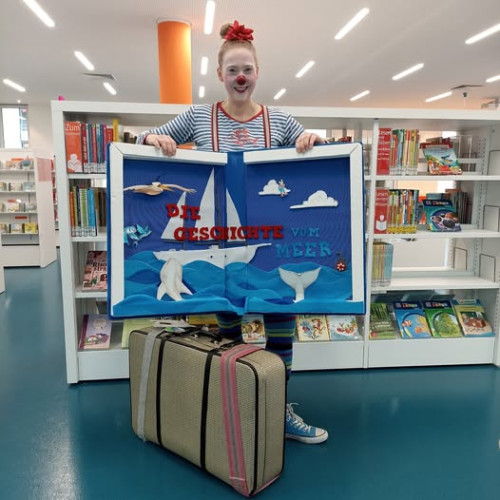 Später der Auftritt. Ich spielte zart. Es ist eine behutsame Arbeit. Ich spürte viel Kraft in mir. Die Kinder juchzten. Sie klatschten plötzlich, als ich den Koffer in die Luft hob. Lachen. Der Clownfisch zog mich zum großen Buch. „Dadange“ sagte ein Kind plötzlich und stand vor mir. Ich kapierte nichts und fragte: „Dadange?“ Die Kinder kicherten. „Orange!“, übersetzte eine Frau. Ach so. Der Moment war so schön … ihre Konzentration, meine Konzentration. Die Freude! Ich freute mich mit. Ich quietschte vor Vergnügen. Es lag ein Zauber in der Luft. Auch bei den Erwachsenen.