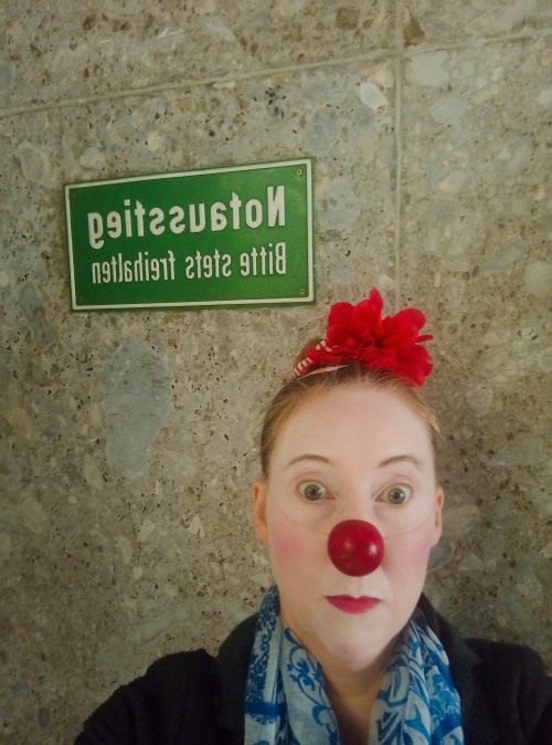 Heute spiele ich für Kinder. Ich fahre geschminkt hin. Die Leute im U-Bahn-Raumschiff schauen mich an, als wäre ich ein Alien. Zumindest die Erdbewohner, die noch Löcher in die Luft starren und nicht in die unendlichen Weiten des Internets gesaugt worden sind. Manche lächeln auch. Der neueste Trend bei den Menschen: Kopfbedeckung mit Kopfhörer und Smartphone in der Hand. Zwei Menschen sitzen einander gegenüber und machen spiegelbildlich das gleiche. Nur ihre Gesichter sind verschieden. Unverständliches Sprachengemurmel dringt an mein Ohr.